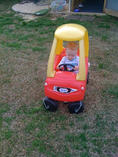 Connor can point to his mouth, ears, belly, and feet if you ask him where it is. I have yet to get this on video though because every time I start recording, he just gives me a blank look and does nothing. I will eventually get it though and it is adorable. He's still eating pretty much anything and everything you give him and he's sleeping all night and waking up between 5:30-6:00. He loves oatmeal or cheerios & milk or a plain whole wheat waffle for breakfast. Oh one more thing, Connor is loving his shoes. He loves to wear them and carry them around the house. He's growing up so fast!